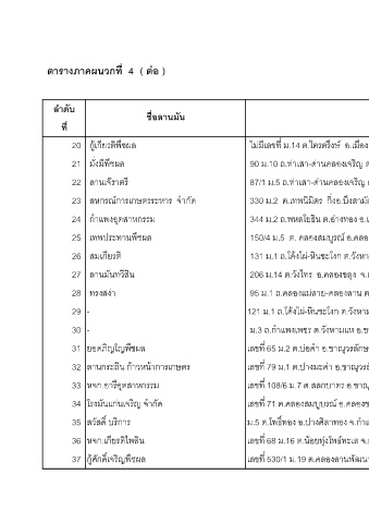 ตารางภาคผนวกที่ 4 ( ตอ ) ลําดับ ชื่อลานม ัน ที่ ืชผล กูเกียรติพ 20 ีพชผล ื มั่งม 21 ลานเจราตรี 22 สหกรณการเกษตรระหาร จํากัด 23 กําแพงอุตสาหกรรม 24 เทพประทานพืชผล 25 สมเกียรติ 26 ิน ลานมันทวีส 27 ทรงสงา 28 - 29 - 30 ิญโญพืชผล ยอดภ 31 าการเกษตร ลานก