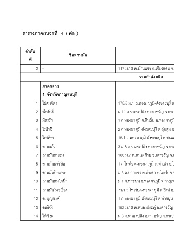 ตารางภาคผนวกที่ 4 ( ตอ ) ลําดับ ชื่อลานม ัน ที่ - 2 ภาคกลาง ี ุร 1. จังหวัดกาญจนบ ไผสมจิตร 1 ีรศักดิ์ พ 2 ัก มิตรร 3 าอ ี๋ ไรป 4 ไรศศิธร 5 ลานแกว 6 ลานมันถนอม 7 ลานมันธวัชชัย 8 ลานมันปยะพร 9 ลานมันสมใจน 10 ึก ือง ลานมันไทยเร 11