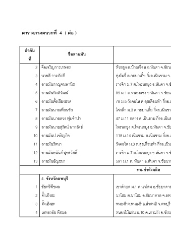 ตารางภาคผนวกที่ 4 ( ตอ ) ลําดับ ชื่อลานม ัน ที่ ิญการเกษตร จือเจร 2 ี การภักดี นายส 3 4 ลานมันกาญจนพานิช ลานมันกิตติวัฒน 5 ลานมันตั้งเชียงฮวด 6 ลานมันนายเทียนชัย 7 ุมจําปา ลานมันนายลวง พ 8 ุรตน นากสงข ั ั ลานมันนายส 9 ิญกิจ ลานมันป.เจร 10 ลานมันรัตนา 11 ุขสว