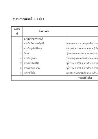ตารางภาคผนวกที่ 4 ( ตอ ) ลําดับ ชื่อลานม ัน ที่ ุพรรณบุร ี 5. จังหวัดส ลานมันเงินประเสริฐศร ี 1 ุรศักดิ์พชผล ื ลานมันส 2 กัมพล 3 ลานมันทุงแสม 4 ิร2 ิ ลานมันทรัพยส 5 ลานมันทิพยปราณี 6 ืชไร พรทิพยพ 7