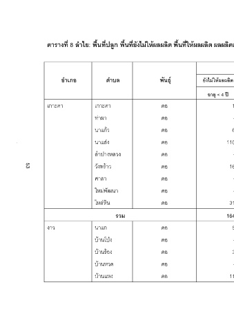 ยังไมใหผลผลิต ใหผลผลิตแลว รวม เฉลี่ย รวมทั้งหมด ตัน กก./ไร รวม อายุ > 12 ป อายุ 4-12 ป อายุ < 4 ป 79 537 149 148 91 57 1 128 584 220 220 144 76 - 551 544 1,018 1,012 677 335 6 658 485 1,467 1,357 897 460 110 24 584 41 41 20 21 - 211 488 448 432 357 75 16 92 536 171 171 139 32 - 131 522 251 251