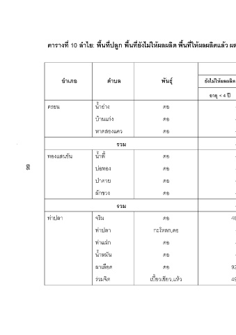 ยังไมใหผลผลิต ใหผลผลิตแลว รวม เฉลี่ย รวมทั้งหมด ตัน กก./ไร รวม อายุ > 12 ป อายุ 4-12 ป อายุ < 4 ป 78 627 125 125 125 - - 86 571 151 151 151 - - 99 562 177 177 177 - - 263 581 453 453 453 - - 62 553 112 112 112 - - 66 486 135 135 115 20 - 184 517 356 356 261 95 - 74 576 129 129 129 - - 386 527 732