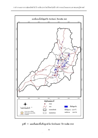 การสํารวจและคาดการณผลผลิตลําไย ปการผลิต 2549 โดยใชเทคโนโลยีการสํารวจระยะไกลและระบบสารสนเทศภูมิศาสตร ํ รูปที่ 11 แผนที่แสดงพ ื้นที่ปลูกลาไย จังหวัดแพร ปการผลิต 2549 70 70