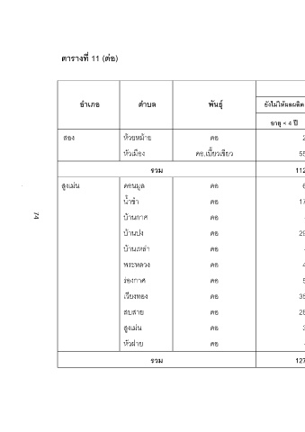 ยังไมใหผลผลิต ใหผลผลิตแลว รวม เฉลี่ย รวมทั้งหมด ตัน กก./ไร รวม อายุ > 12 ป อายุ 4-12 ป อายุ < 4 ป 53 515 104 102 7 95 2 94 582 216 161 35 126 55 486 467 1,152 1,040 282 758 112 16 582 33 27 16 11 6 152 580 279 262 236 26 17 4 538 7 7 - 7 - 239 559 456 427 40 387 29 1 583 2 2 - 2 - 59 511 120