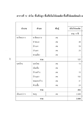 ยังไมใหผลผลิต ใหผลผลิตแลว รวม เฉลี่ย รวมทั้งหมด ตัน กก./ไร รวม ายุ > 12 ป อ ายุ 4-12 ป อ อายุ < 4 ป 290 667 435 435 362 73 - 178 524 387 339 168 171 48 463 626 798 739 501 238 59 383 590 669 649 600 49 20 43 378 115 115 - 115 - 1,357 596 2,404 2,277 1,631 646 127 239 568 430 420 353 67 10 104