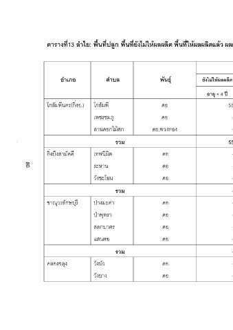 ยังไมใหผลผลิต ใหผลผลิตแลว รวม เฉลี่ย รวมทั้งหมด ตัน กก./ไร รวม อายุ > 12 ป อายุ 4-12 ป อายุ < 4 ป 440 421 1,099 1,044 727 317 55 57 448 127 127 44 83 - 104 570 182 182 17 165 - 601 444 1,408 1,353 788 565 55 96 576 166 166 - 166 - 197 544 362 362 362 - - 88 512 171 171 29 142 - 381 545 699 699 391 308 -