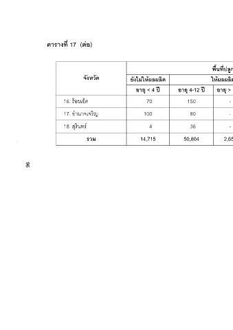 พื้นที่ปลูก (ไร) ผลผลิต ผลผลิตรวม ผลผลิตเฉลี่ย ใหผลผลิตแลว รวมทั้งหมด ตัน กก./ไร รวม อายุ > 12 ป 73 487 220 150 - 37 463 180 80 - 17 472 40 36 - 25,829 483 68,171 5,3456 2,652