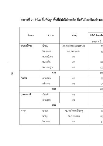 ยังไมใหผลผลิต ใหผลผลิตแลว รวม เฉลี่ย รวมทั้งหมด ตัน กก./ไร รวม อายุ > 12 ป อายุ 4-12 ป อายุ < 4 ป 102 485 281 211 - 211 70 46 475 150 97 - 97 53 24 469 52 52 - 52