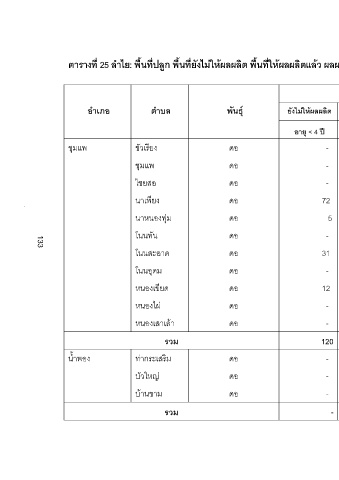 ยังไมใหผลผลิต ใหผลผลิตแลว รวม เฉลี่ย รวมทั้งหมด ตัน กก./ไร รวม อายุ > 12 ป อายุ 4-12 ป อายุ < 4 ป 38 489 77 77 - 77 - 45 501 89 89 - 89 - 36 493 73 73 -