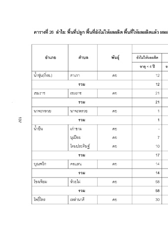 ยังไมใหผลผลิต รวม เฉลี่ย ใหผลผลิตแลว รวมทั้งหมด ตัน กก./ไร รวม อายุ > 12 ป อายุ 4-12 ป อายุ < 4 ป 181 617 305 293 30 263 12 181 617 305 293 30 263 12 76 345 242 221 - 221 21 76
