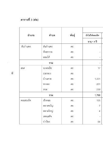 ยังไมใหผลผลิต ใหผลผลิตแลว รวม เฉลี่ย รวมทั้งหมด ตัน กก./ไร รวม อายุ > 12 ป อายุ 4-12 ป อายุ < 4 ป 513 831 617 617 70 547 - 414 734 564 564 12 552 - 385 604 637 637 4 633 - 3,370 764 4,413 4,413 285 4,128 - 260 334 795 778 194 584 17 13 228 55 55 1 54 - 7,311 746 11,131 9,800 5,836 3,964 1,331 2,555 580 4,6