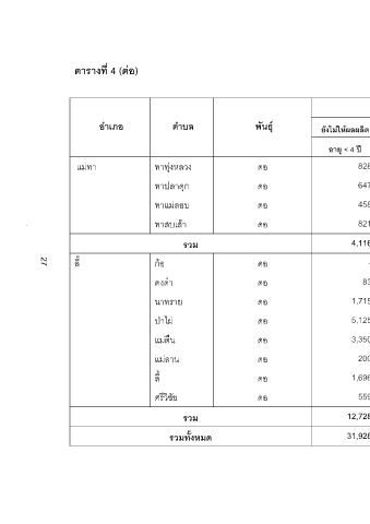 ยังไมใหผลผลิต ใหผลผลิตแลว รวม เฉลี่ย รวมทั้งหมด ตัน กก./ไร รวม อายุ > 12 ป อายุ 4-12 ป อายุ < 4 ป 1,657 987 2,507 1,679 685 994 828 503 632 1,443 796 126 670 647 232 604 842 384 7 377 458 2,621 604 5,161 4,340 1,124 3,216 821 10,330 657 19,850 15,374 6,212 9,522 4,116 126 568 222 222 147 75 - 590 880 753 670 253