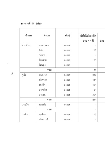 ยังไมใหผลผลิต ใหผลผลิตแลว รวม เฉลี่ย รวม ทั้งหมด ตัน กก./ไร รวม อายุ > 12 ป อายุ 4-12 ป อายุ < 4 ป 31 387.00 80 80 - 80 - 44 391.00 123 113 - 113 10 33 33 - 33 - 13 383.00 7 380.00 30 19 - 19 11 63 395.00 159 159 - 159 - 596 563 8