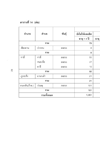 ยังไมใหผลผลิต ใหผลผลิตแลว รวม เฉลี่ย รวม ทั้งหมด ตัน กก./ไร รวม อายุ > 12 ป อายุ 4-12 ป อายุ < 4 ป 180 101 - 101 79 39 386.14 - - 8 - - - 8 - - 8 - - - 8 - - 55 - - -
