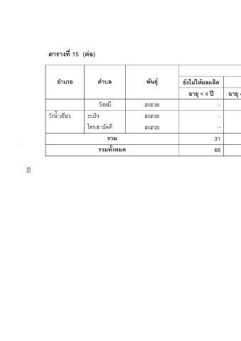 ยังไมใหผลผลิต ใหผลผลิตแลว รวม เฉลี่ย รวม ทั้งหมด ตัน กก./ไร รวม อายุ > 12 ป อายุ 4-12 ป อายุ < 4 ป 115 695.00 166 166 - 166 - 15 641.00 24 24 - 24 - 357 357 - 357 - 240 671.00 626 624.13 1,034 1,003 10 993 31 1,354 1,289 56 1,233 65 802 622.19
