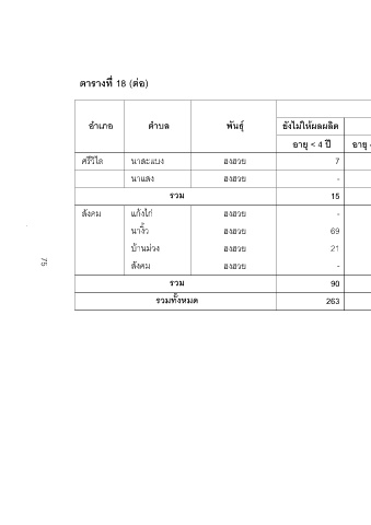 ยังไมใหผลผลิต ใหผลผลิตแลว รวม เฉลี่ย รวม ทั้งหมด ตัน กก./ไร รวม อายุ > 12 ป อายุ 4-12 ป อายุ < 4 ป 5 500.00 17 10 - 10 7 5 498.00 10 10 - 10 - 45 30 - 30 15 15 500.00 24 642.00 38