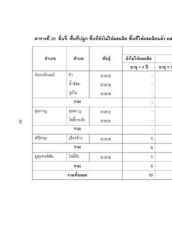 อายุ 4-12 ป รวมทั้งหมด ตัน กก./ไร รวม อายุ > 12 ป 2 2 - 2 1 512.00 8 8 - 8 4 539.00 4 4 - 4 2 543.00 14 14 - 14 7 500.00 58 58 - 58 29 506.00 44 44 - 44 22 500.00 102 102 - 102 51 500.00 - - 5 - - - - - 5 - - - 30 25 - 25 13 520.00 30 25 - 25 13 520.00 151 141 - 141 71 503.55