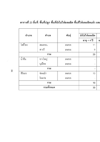 ยังไมใหผลผลิต ใหผลผลิตแลว รวม เฉลี่ย รวมทั้งหมด ตัน กก./ไร รวม อายุ > 12 ป อายุ 4-12 ป อายุ < 4 ป - - 11 - - - 11 - - 9 - - - 9 - - 20 - - - 20 32 549.00 58 - 58 - 24 514.00
