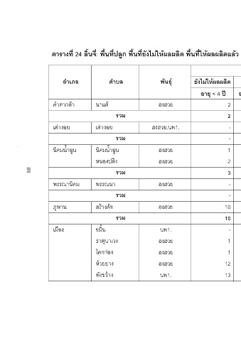 ยังไมใหผลผลิต ใหผลผลิตแลว รวม เฉลี่ย รวมทั้ง หมด ตัน กก./ไร รวม อายุ > 12 ป อายุ 4-12 ป อายุ < 4 ป - - 2 - - - 2 - - 2 - - - 2 - 100.00 1 1 - - - 100.00 1 1 1 - - - -