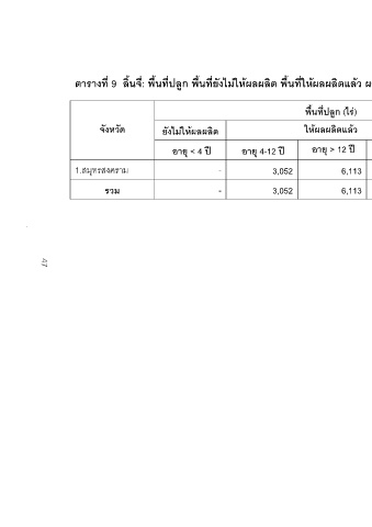 พื้นที่ปลูก (ไร) ผลผลิต ใหผลผลิตแลว ผลผลิตรวม ผลผลิตเฉลี่ย รวมทั้งหมด อายุ > 12 ป ตัน กก./ไร รวม 5,087 555.05 9,165 9,165 6,113 5,087 555.05 9,165 9,165 6,113